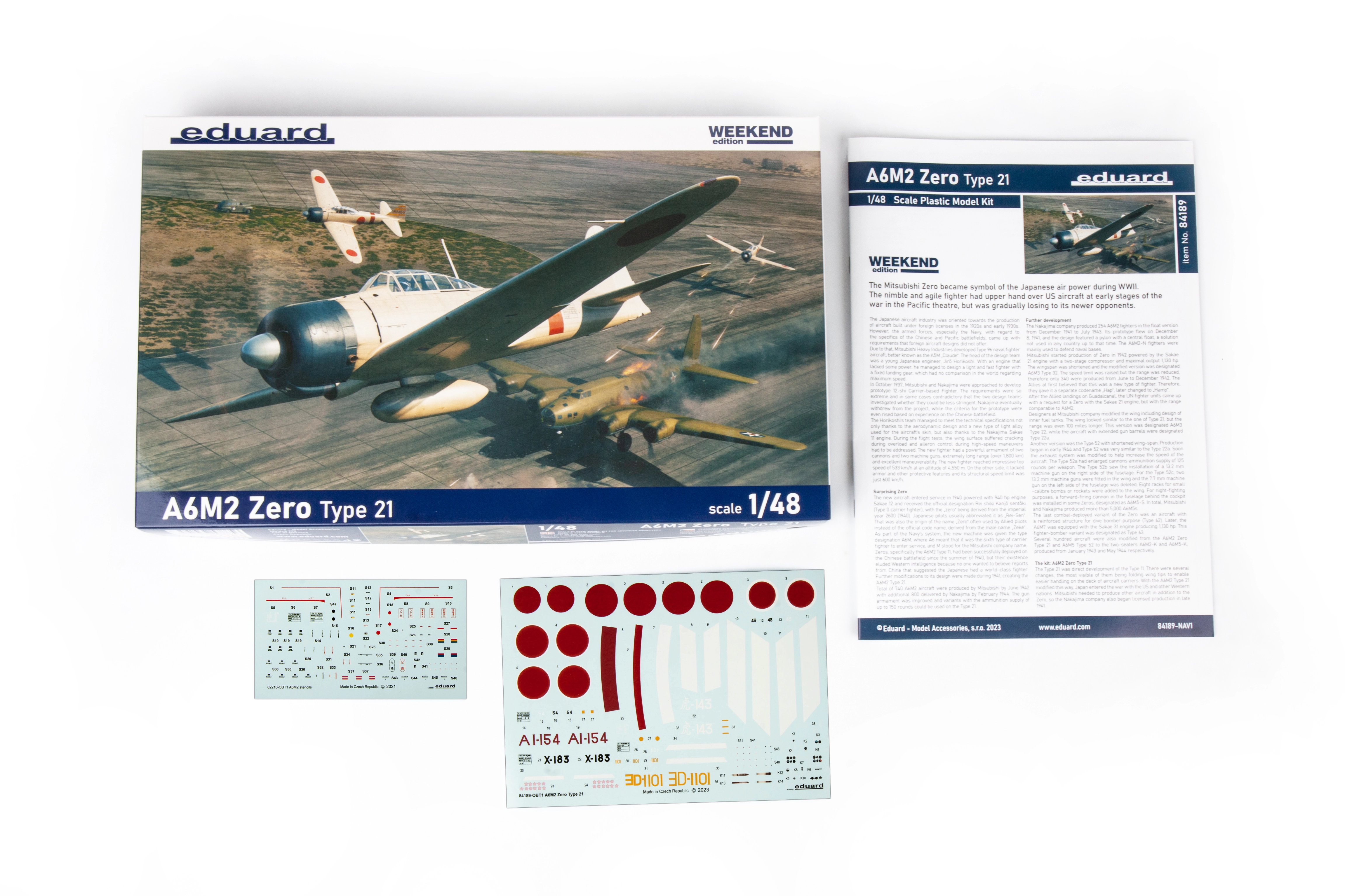 Go to cart1/48 Mitsubishi A6M2 Zero Type 21 Weekend (for Eduard)The Mitsubishi A6M, also known as the Zero, was a long-range embarked fighter produced by Mitsubishi Heavy Industries and used by the Imperial Japanese Navy from 1940 until 1945.Regarded at the time of its introduction as the best embarked fighter in the world, it continued to be produced until the end of World War II, despite the fact that it had by then been surpassed in maneuverability, speed, armament and protection by newer Allied aircraft. In the last years of the war it was frequently used in kamikaze operations.